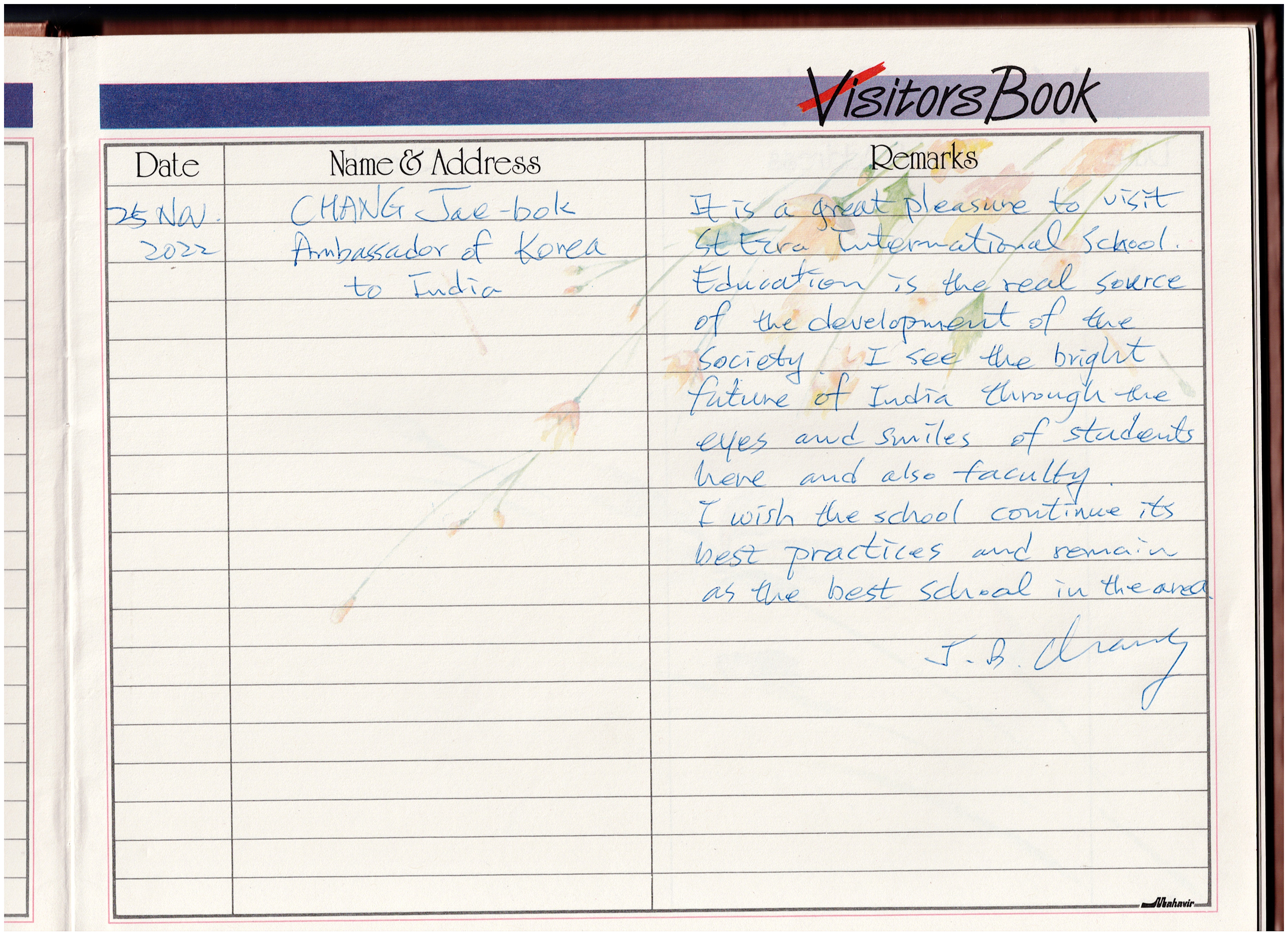 " It is a great pleasure to visit St. Ezra International School. Education is the source of the development of the society. I see the bright future of India through the eyes and smiles of students have and also faculty.